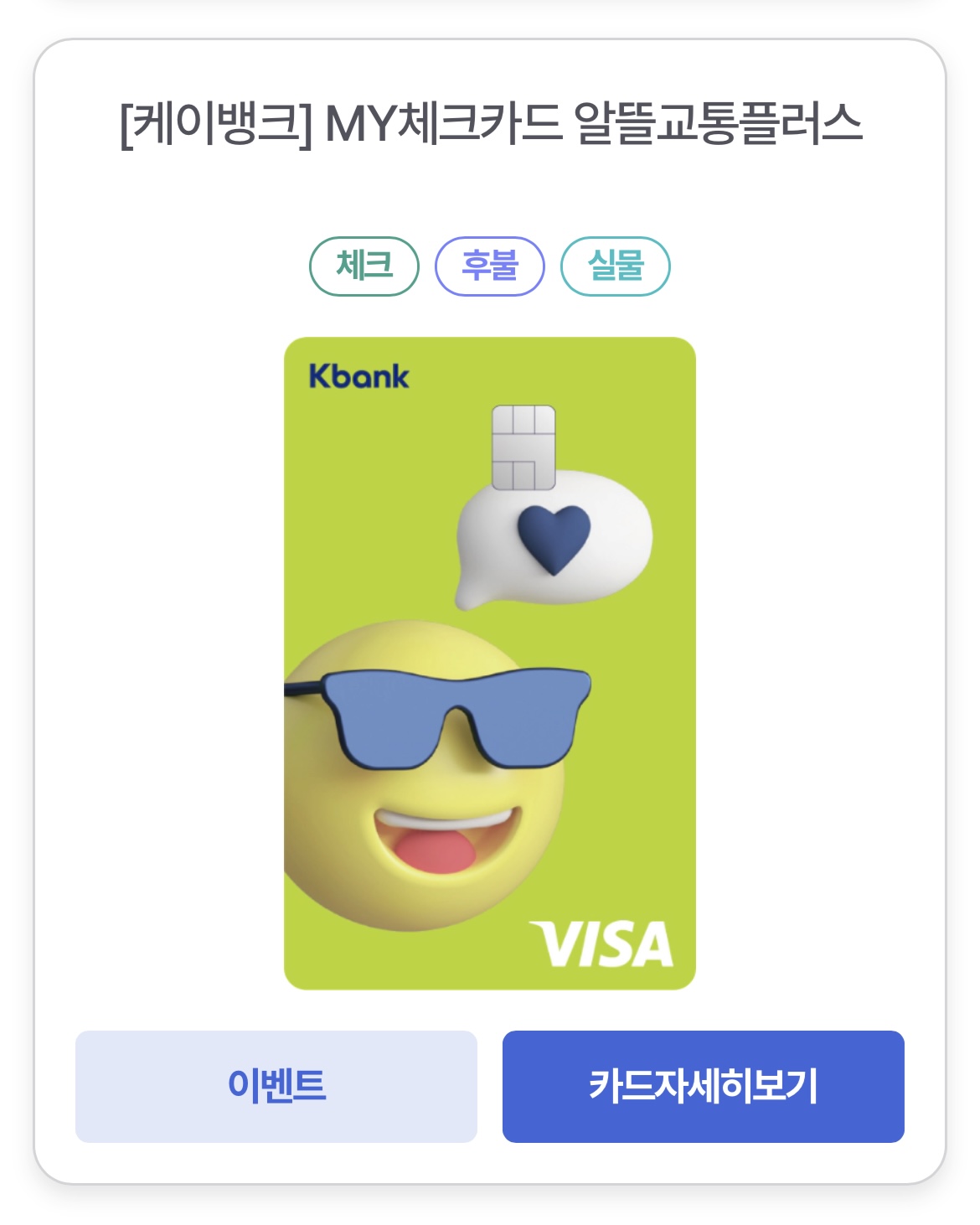 케이뱅크 MY체크카드는 대중교통 이용금액이 월 5만원이상일 경우 매월 3천원 추가 캐시백을 제공합니다. 체크카드이기 때문에 연회비 없이 알뜰교통 플러스 혜택과는 별도로 제공되는 서비스입니다.