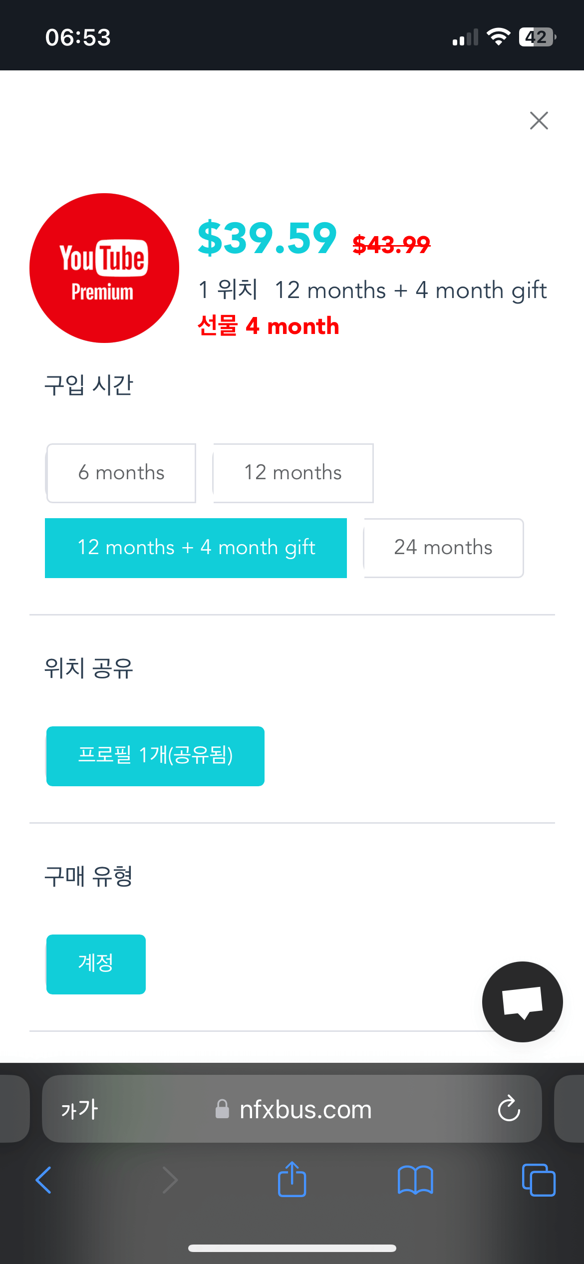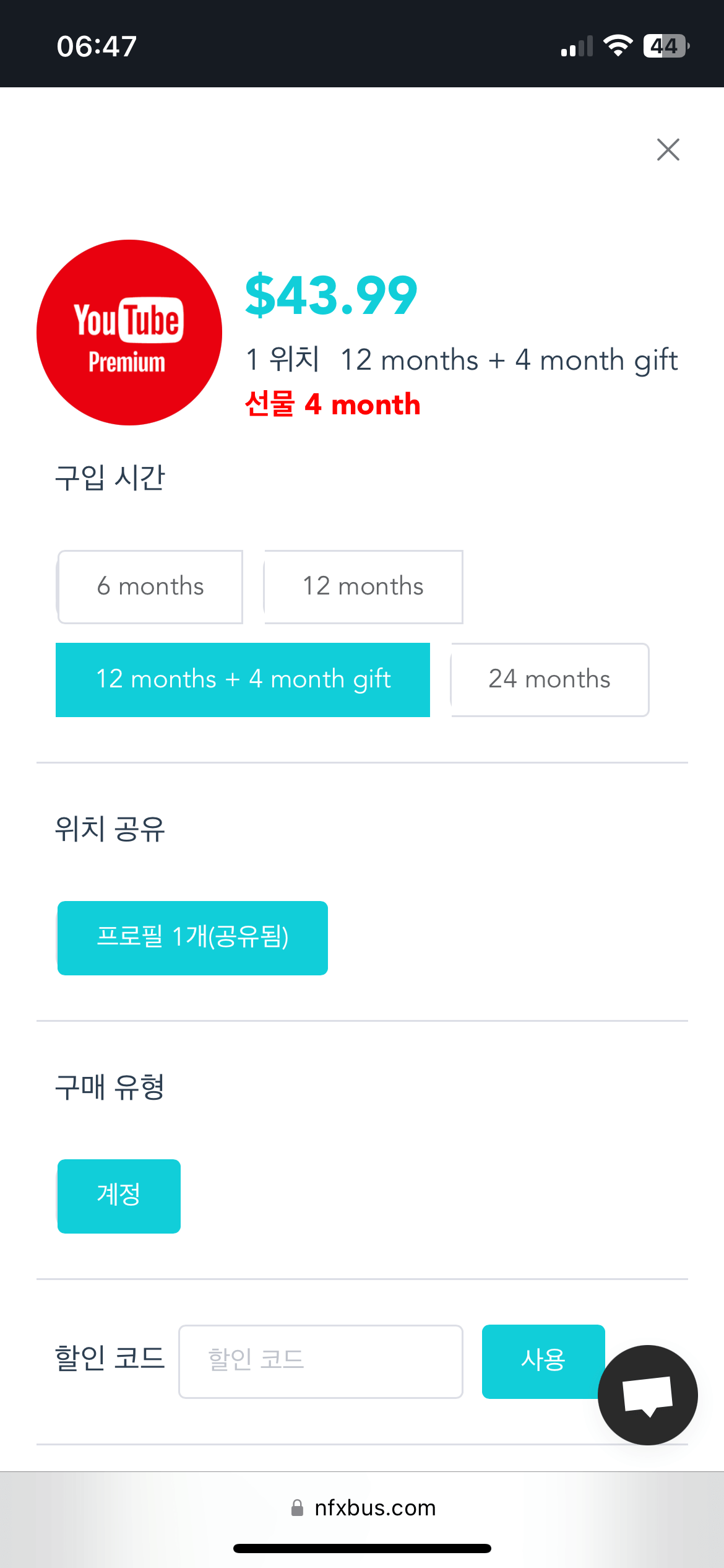 현재 NFXBUS 에서 유튜브 프리미엄을 1년 구독 시, 4개월 구독권을 무료로 제공하고 있으며, 할인 코드 VYU9A3을 입력하면 10%할인을 받을 수 있습니다. 16개월에 43.99달러였는데 할인코드를 적용하니 39.59 달러였고, 월 3천원대로 볼 수 있습니다. 현재 환율이 높아서 월 3천원대지만, 달러 환율이 떨어지면 월 2천원대도 가능해 보입니다.