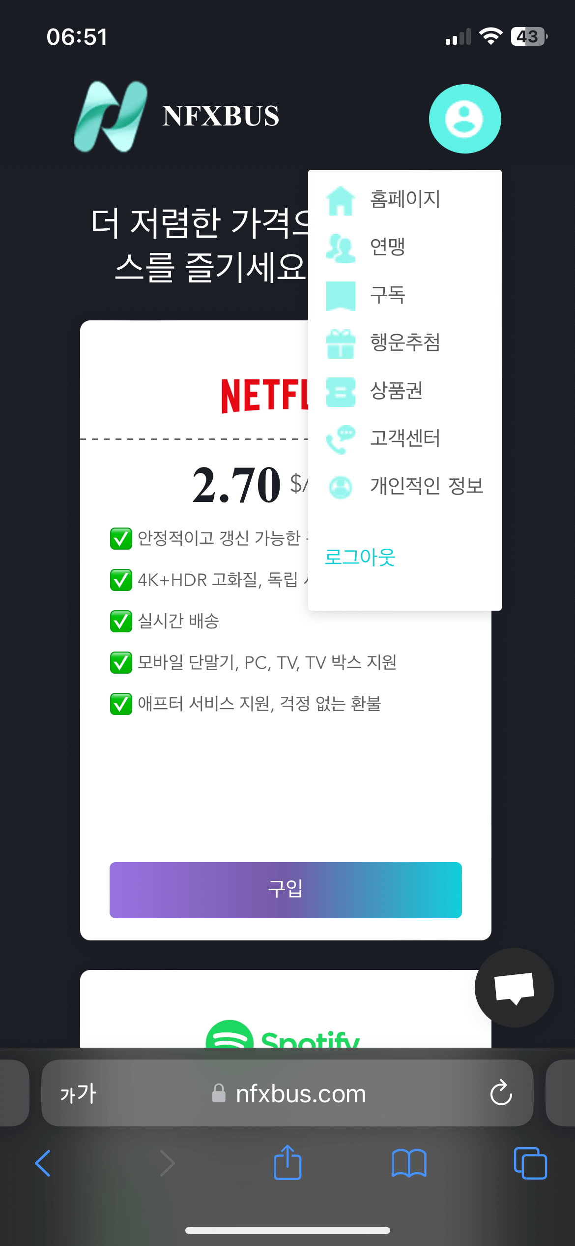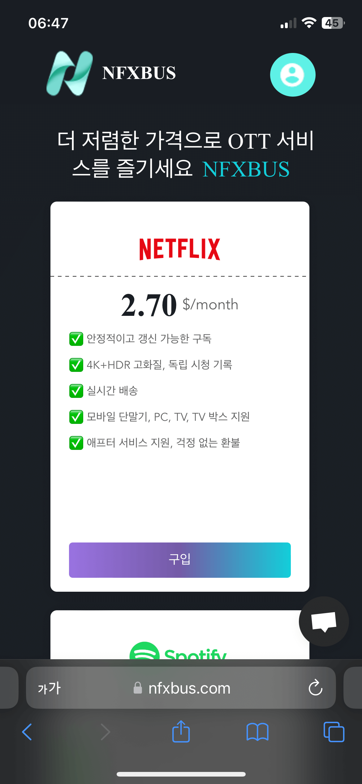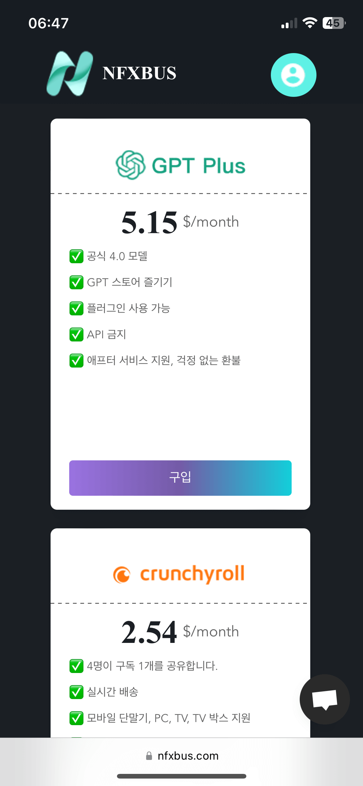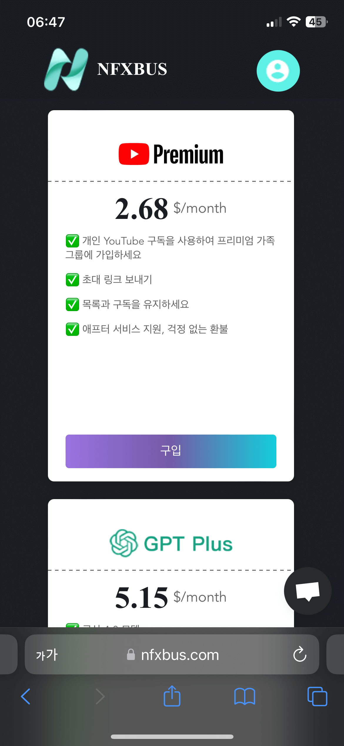 NFXBUS 사이트에서는 NETFLIX(넷플릭스), 유튜브 프리미엄, Chat. GPT Plus, 디즈니 플러스 등에 가입할 수 있습니다. 유튜브 프리미엄은 매월 2.68달러이고 현재 한화 기준으로는 약 3,500원입니다.