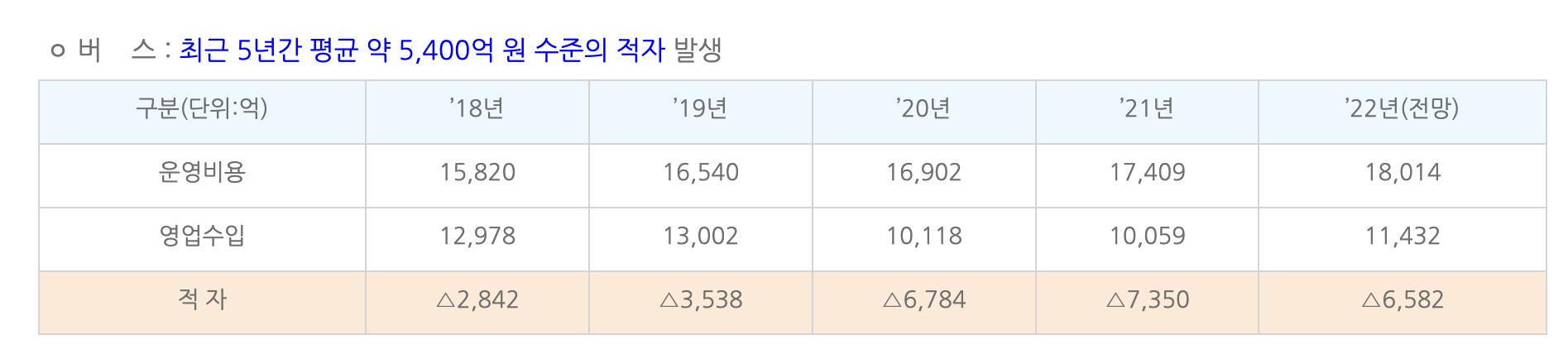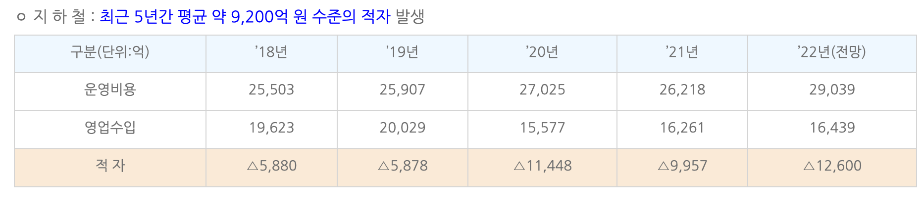 2018년부터 2022년까지 5년간 지하철의 적자 수준은 평균 약 9,200억원이 발생하고 있었습니다. 버스는 최근 5년간 평균 약 5,400억 원 수준의 적자가 발생하고 있습니다.