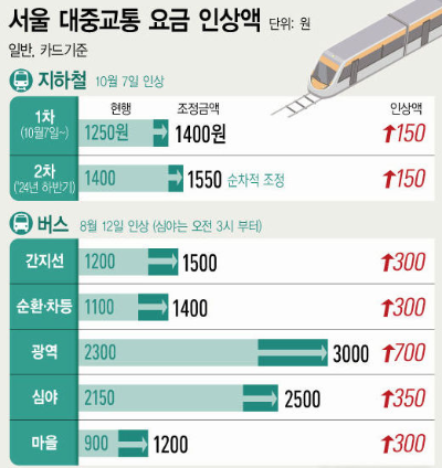 2023년 8월 12일부터 버스 요금이 인상되고, 10월 7일부터 지하철 요금이 인상될 예정입니다.