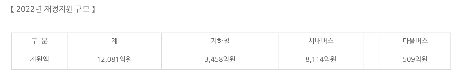 2022년 재정지원 규모만 봐도 지하철은 3,456억원, 시내버스는 8,114억원 그리고 마을버스는 509억원으로 총 1조 2천억원 수준에 달하였습니다.